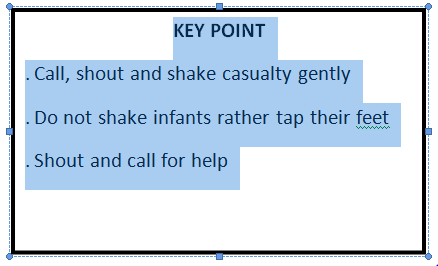 Response: Check for the level of response by shouting and gently shake/tap casualty’s shoulder to determine whether the victim is conscious or unconscious.